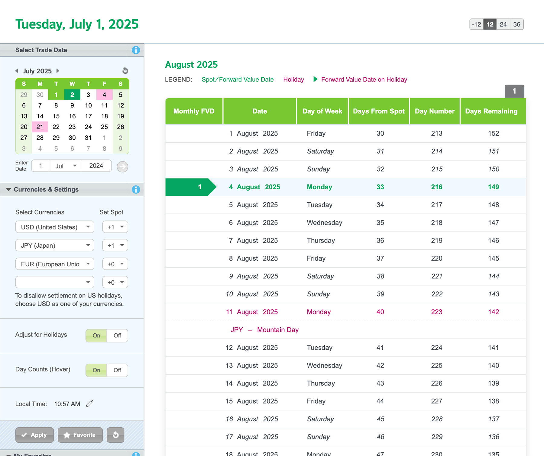 See monthly forward value dates in a list format for 3 years forward and 1 year back (including day counts and holidays.)